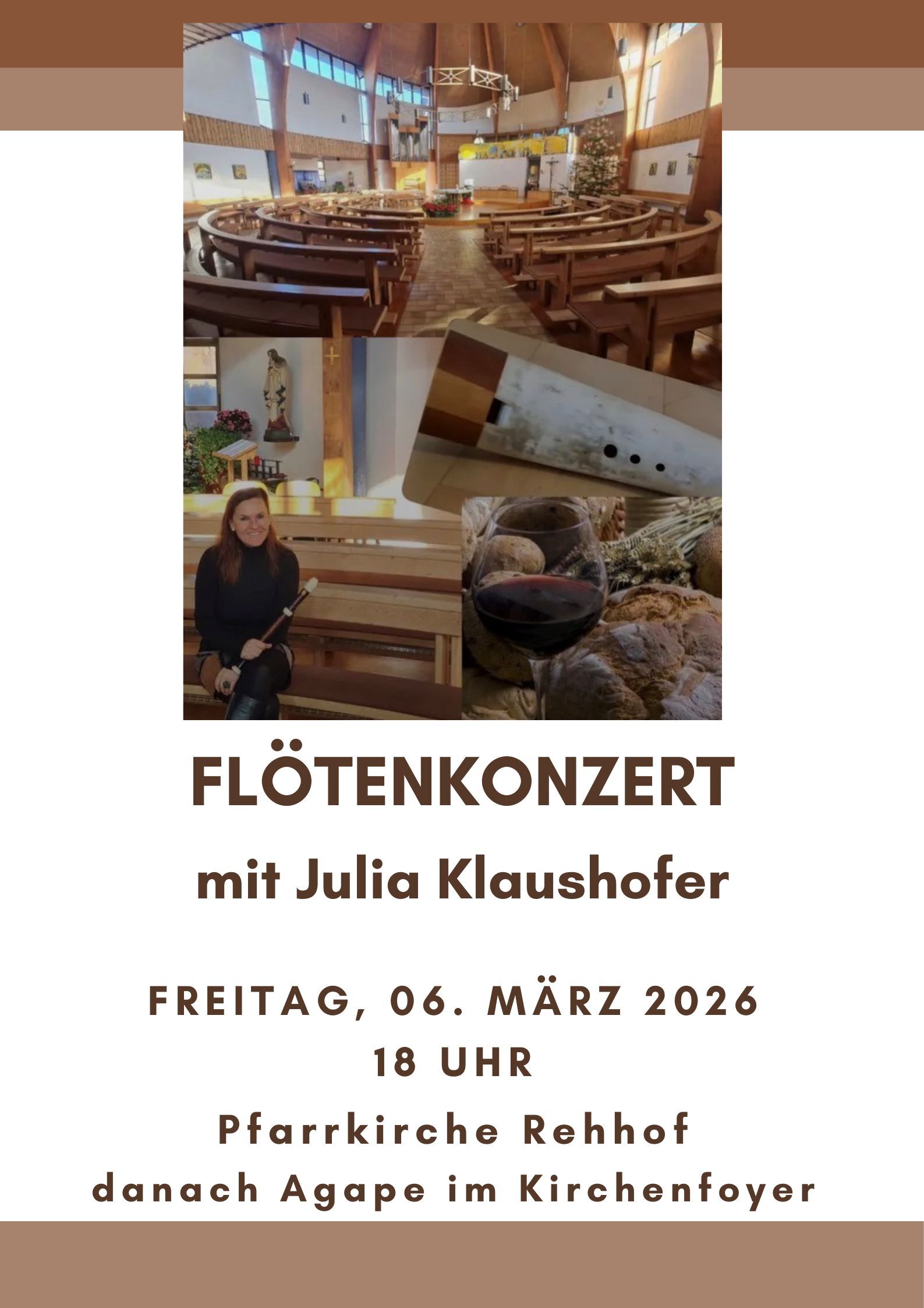 Am 6. März spielt Julia Klaushofer ein Flötenkonzert in der Pfarrkirche Rehhof. Im Anschluss gibt es eine Agape im Kirchenfoyer.